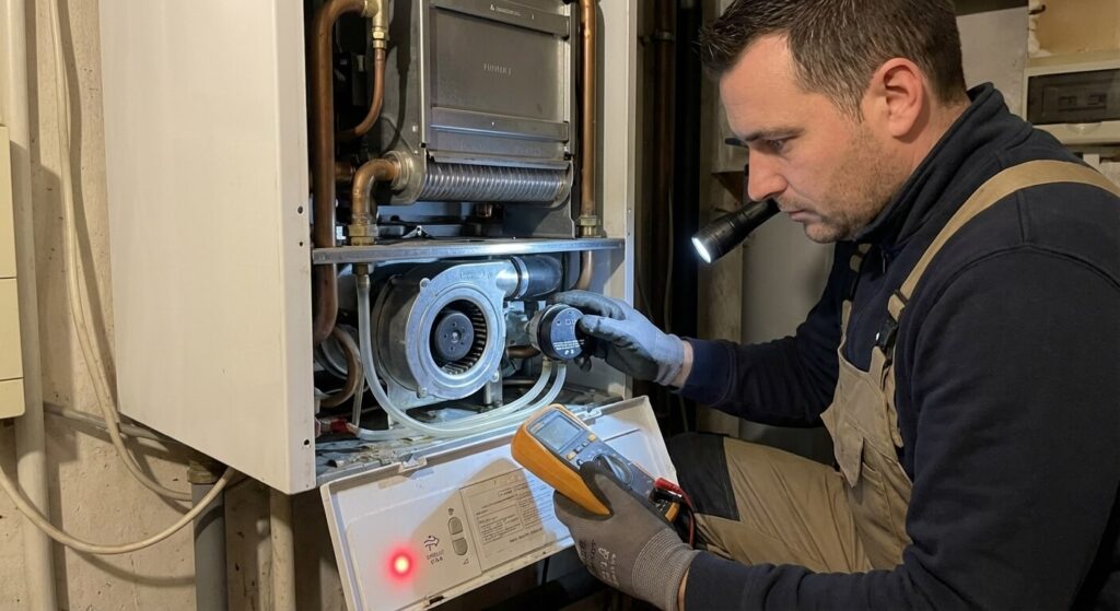 - ⚙️ La panne de l’extracteur : Le ventilateur (extracteur) situé en haut de la chaudière, censé expulser les fumées, peut être bloqué par la poussière ou avoir son moteur grillé.